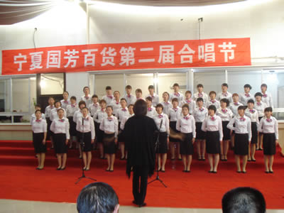 (主持人在現(xiàn)場宣布“寧夏國芳百貨第二屆合唱”節(jié)開幕)