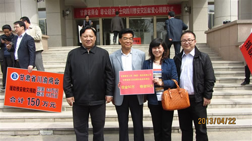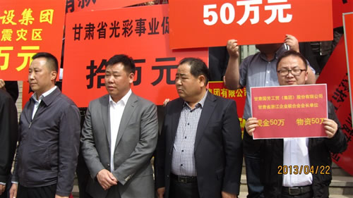 2013年4月22日下午15時,在甘肅省政協(xié)一樓,由甘肅省委常委、省委統(tǒng)戰(zhàn)部部長澤巴足,省委統(tǒng)戰(zhàn)部副部長、甘肅省工商聯(lián)黨組書記、第一副主席吳繼德等相關領導出席了“甘肅省商會非公經(jīng)濟人士向四川雅安災區(qū)獻愛心捐贈儀式”。捐贈現(xiàn)場眾多甘肅省非公企業(yè)向4月20日雅安市地震災區(qū)進行了捐贈,廣大愛心企業(yè)和人士用自己的實際行動對災區(qū)同胞奉獻了自己的真情和祝福。