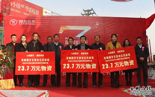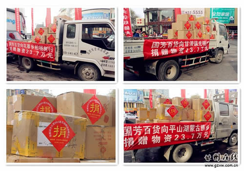 11月22日上午,張掖國芳百貨公司7周年慶典之際,為我區(qū)甘浚鎮(zhèn)光明村、花寨鄉(xiāng)柏楊樹村和平山湖鄉(xiāng)困難群眾一次性捐贈了價值71萬元的物資。區(qū)委常委、常務(wù)副區(qū)長秦偉、副區(qū)長張興鋒出席了捐贈儀式。